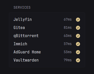 ``` > [!NOTE] > > Setting this property will override any query parameters that are already in the URL. ```yaml parameters: param1: value1 param2: - item1 - item2 ``` ### Extension Display a widget provided by an external source (3rd party). If you want to learn more about developing extensions, checkout the [extensions documentation](extensions.md) (WIP). ```yaml - type: extension url: https://domain.com/widget/display-a-message allow-potentially-dangerous-html: true parameters: message: Hello, world! ``` #### Properties | Name | Type | Required | Default | | ---- | ---- | -------- | ------- | | url | string | yes | | | fallback-content-type | string | no | | | allow-potentially-dangerous-html | boolean | no | false | | headers | key & value | no | | | parameters | key & value | no | | ##### `url` The URL of the extension. **Note that the query gets stripped from this URL and the one defined by `parameters` gets used instead.** ##### `fallback-content-type` Optionally specify the fallback content type of the extension if the URL does not return a valid `Widget-Content-Type` header. Currently the only supported value for this property is `html`. ##### `headers` Optionally specify the headers that will be sent with the request. Example: ```yaml headers: x-api-key: ${SECRET_KEY} ``` ##### `allow-potentially-dangerous-html` Whether to allow the extension to display HTML. > [!WARNING] > > There's a reason this property is scary-sounding. It's intended to be used by developers who are comfortable with developing and using their own extensions. Do not enable it if you have no idea what it means or if you're not **absolutely sure** that the extension URL you're using is safe. ##### `parameters` A list of keys and values that will be sent to the extension as query paramters. ### Weather Display weather information for a specific location. The data is provided by https://open-meteo.com/. Example: ```yaml - type: weather units: metric hour-format: 12h location: London, United Kingdom ``` > [!NOTE] > > US cities which have common names can have their state specified as the second parameter as such: > > * Greenville, North Carolina, United States > * Greenville, South Carolina, United States > * Greenville, Mississippi, United States Preview:  Each bar represents a 2 hour interval. The yellow background represents sunrise and sunset. The blue dots represent the times of the day where there is a high chance for precipitation. You can hover over the bars to view the exact temperature for that time. #### Properties | Name | Type | Required | Default | | ---- | ---- | -------- | ------- | | location | string | yes | | | units | string | no | metric | | hour-format | string | no | 12h | | hide-location | boolean | no | false | | show-area-name | boolean | no | false | ##### `location` The name of the city and country to fetch weather information for. Attempting to launch the applcation with an invalid location will result in an error. You can use the [gecoding API page](https://open-meteo.com/en/docs/geocoding-api) to search for your specific location. Glance will use the first result from the list if there are multiple. ##### `units` Whether to show the temperature in celsius or fahrenheit, possible values are `metric` or `imperial`. #### `hour-format` Whether to show the hours of the day in 12-hour format or 24-hour format. Possible values are `12h` and `24h`. ##### `hide-location` Optionally don't display the location name on the widget. ##### `show-area-name` Whether to display the state/administrative area in the location name. If set to `true` the location will be displayed as: ``` Greenville, North Carolina, United States ``` Otherwise, if set to `false` (which is the default) it'll be displayed as: ``` Greenville, United States ``` ### Monitor Display a list of sites and whether they are reachable (online) or not. This is determined by sending a GET request to the specified URL, if the response is 200 then the site is OK. The time it took to receive a response is also shown in milliseconds. Example: ```yaml - type: monitor cache: 1m title: Services sites: - title: Jellyfin url: https://jellyfin.yourdomain.com icon: /assets/jellyfin-logo.png - title: Gitea url: https://gitea.yourdomain.com icon: /assets/gitea-logo.png - title: Immich url: https://immich.yourdomain.com icon: /assets/immich-logo.png - title: AdGuard Home url: https://adguard.yourdomain.com icon: /assets/adguard-logo.png - title: Vaultwarden url: https://vault.yourdomain.com icon: /assets/vaultwarden-logo.png ``` Preview:  You can hover over the "ERROR" text to view more information. #### Properties | Name | Type | Required | Default | | ---- | ---- | -------- | ------- | | sites | array | yes | | | style | string | no | | | show-failing-only | boolean | no | false | ##### `show-failing-only` Shows only a list of failing sites when set to `true`. ##### `style` Used to change the appearance of the widget. Possible values are `compact`. Preview of `compact`:  ##### `sites` Properties for each site: | Name | Type | Required | Default | | ---- | ---- | -------- | ------- | | title | string | yes | | | url | string | yes | | | check-url | string | no | | | error-url | string | no | | | icon | string | no | | | allow-insecure | boolean | no | false | | same-tab | boolean | no | false | | alt-status-codes | array | no | | `title` The title used to indicate the site. `url` The public facing URL of a monitored service, the user will be redirected here. If `check-url` is not specified, this is used as the status check. `check-url` The URL which will be requested and its response will determine the status of the site. If not specified, the `url` property is used. `error-url` If the monitored service returns an error, the user will be redirected here. If not specified, the `url` property is used. `icon` Optional URL to an image which will be used as the icon for the site. Can be an external URL or internal via [server configured assets](#assets-